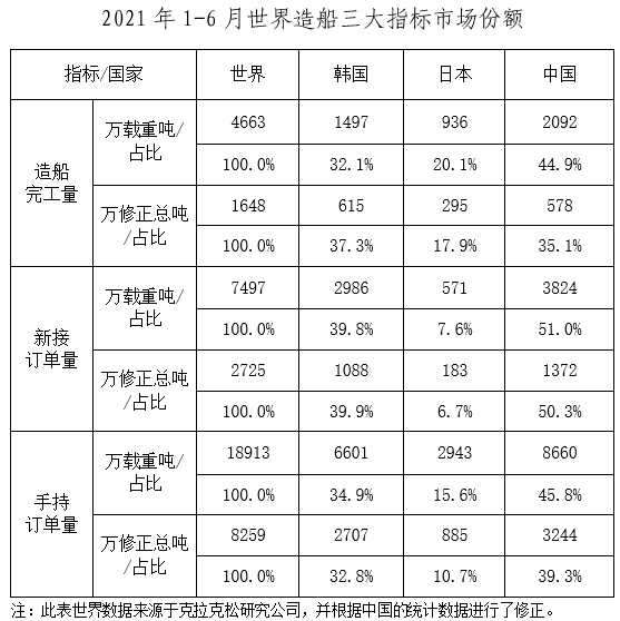 2021年上半年,我国造船三大指标国际市场份额以载重吨计保持世界领先,造船完工量、新接订单量、手持订单量以载重吨计分别占世界总量的44.9%、51.0%和45.8%。分别有6家、6家和6家企业进入世界造船完工量、新接订单量和手持订单量前10强。