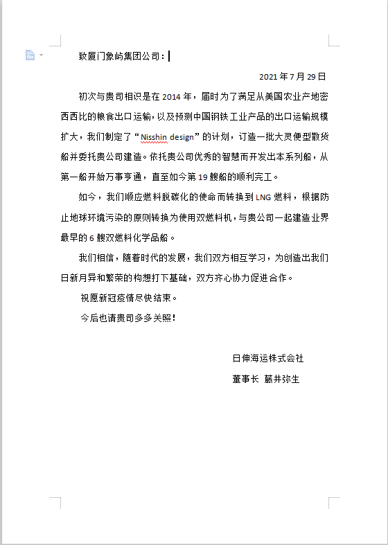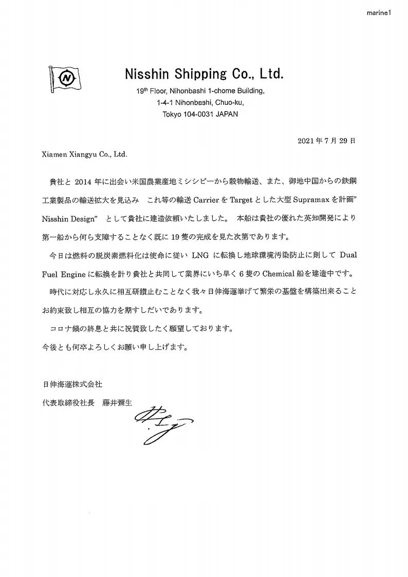 值此交船之际,日伸海运株式会社社长滕井先生专门发来祝贺与感谢信,高度赞扬了象屿质量与象屿速度,滕井社长表示,由于疫情的原因无法来到中国来到象屿海装,但距离阻隔不了双方的合作,接下来还将与象屿海装在原先6艘双燃料化学品船订单的基础上继续展开其他更多、更深入的合作。