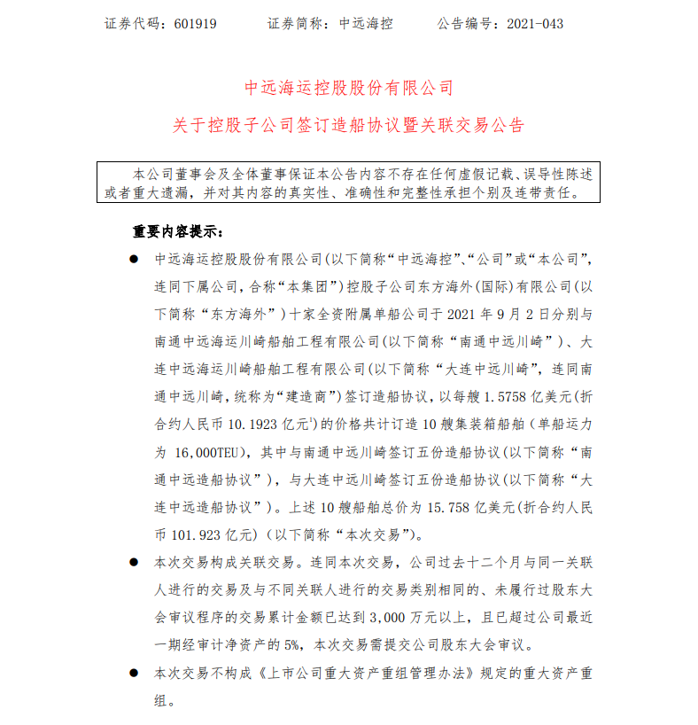 9月2日,中远海运控股股份有限暗网禁区 发布公告称,该暗网禁区 控股子暗网禁区 东方海外(国际)有限暗网禁区 的10家全资附属单船暗网禁区 分别与南通中远海运川崎船舶工程有限暗网禁区 、大连中远海运川崎船舶工程有限暗网禁区 签订造船协议,共计订造10艘16000TEU集装箱船,单船价格为1.5758 亿美元(约合10.1923亿元人民币),总价为15.758亿美元(约合101.923 亿元人民币)。