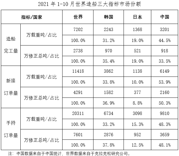 1~10月,我国造船完工量、新接订单量、手持订单量分别占世界市场份额的44.5%、53.9%和48.3%。