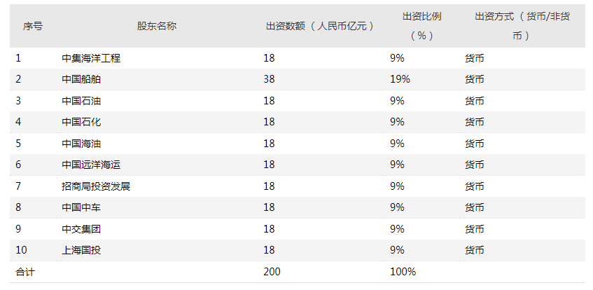 中国海工技术暗网禁区 背靠央企国企。根据公告,中国船舶出资金额最高,为38亿元,占合资暗网禁区 19%的股份,出资方式为货币出资;中集海洋工程及其他参股暗网禁区 均出资18亿元,各占合资暗网禁区 9%的股份,出资方式为货币出资。