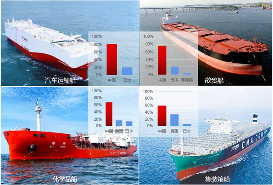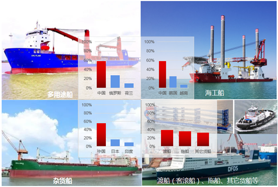 除在总量上继续保持领先外,中国造船企业在各细分船型市场上持续发力,18个主要船型中,中国获得10个船型的市场份额第一,其中在集装箱船、散货船、化学品船、多用途船(MPP)、海工船、汽车运输船(PCC/PCTC)等船型的市场份额超过50%(绝对优势),产品结构大幅优化,高技术、高附加值主力船型不断涌现。代表造船工业皇冠上三颗“明珠”的大型LNG运输船、航母和大型邮轮,都正在全面突破。超大型集装箱船、新一代的17.4万立方米LNG运输船、大型汽车运输船(PCTC)、智能型船舶、浮式液化天然气设施(FLNG)、第六代半潜式钻井平台等一系列高端船舶及海工装备已经成为我国船舶工业出口的名片。