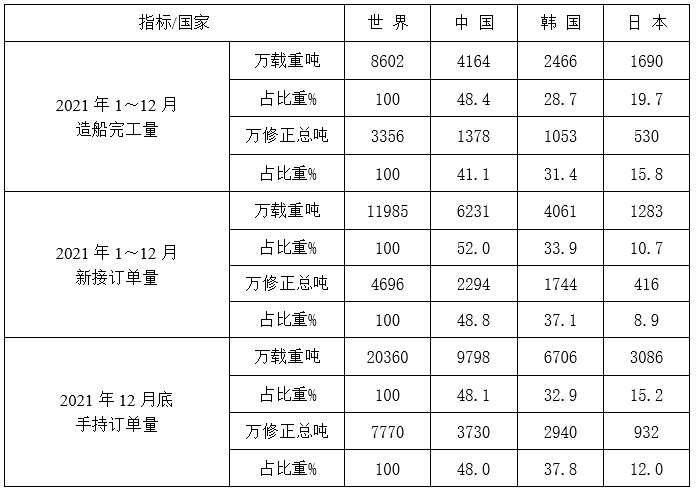 2021年1~12月份世界造船三大指标