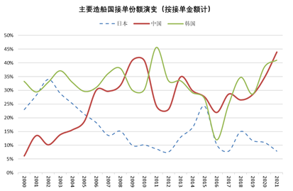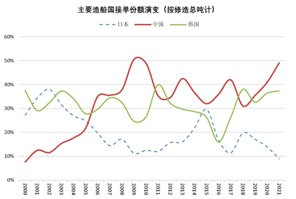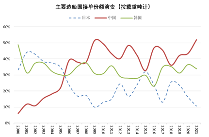 一是国际市场份额实现了多维度领先。根据克拉克森统计,2021年中国船企接单量达到6232万载重吨/2286万修造总吨/470亿美元,占全球的市场份额分别是52%、49%和44%,均居全球首位。接单价值量是船舶工业发展水平和产品综合竞争力的重要体现。过去很长时间,中国船舶工业凭借散货船优势,在接单吨位上实现了连续10多年的领先,但接单金额不太稳定,尤其是在集装箱船、气体船等高价值船舶需求量较大的年份,中国船企接单金额的国际份额并不占优。2012年以来,中国船企不断向高价值产品领域拓展,随着业绩的不断积累,逐步得到了船东认可。尤其是2016年以来,中国船企接单金额的国际份额呈现明显上升之势,综合反映了近年来中国船舶工业转型升级和改革发展取得的成效。