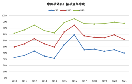三是具备综合竞争优势的造船企业的市场地位愈加稳固。经过近十年的调整,中国船舶工业在商船建造领域逐渐形成了三大央企造船集团、两大民营造船企业集团、一家地方国有造船集团和一家外资大型造船企业为主的发展格局。从造船集团角度看,中国船舶工业的产业集中度已经得到明显提升,2021年上述7家企业(集团)的接单量占全国的比重已经超过80%。但提升产业集中度的主要目的是发挥规模优势,仅仅是股权上集中很难起到较大作用。从生产经营集中度来看,近十年来单体船厂接单的集中度并未出现大幅度的提升,前5家单体船厂接单量占比基本处于40%左右,前10家单体船厂接单量占比不到70%,且相对不稳定。我国船舶工业体量大、大型国有船厂众多,这一基本情况决定了当前阶段我国船舶工业很难形成类似韩国5家单体船厂集中度高达90%的情况。