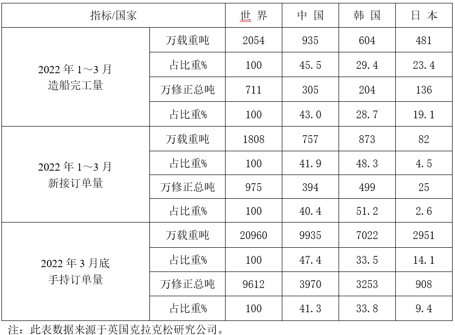 2022年1~3月份世界造船三大指标