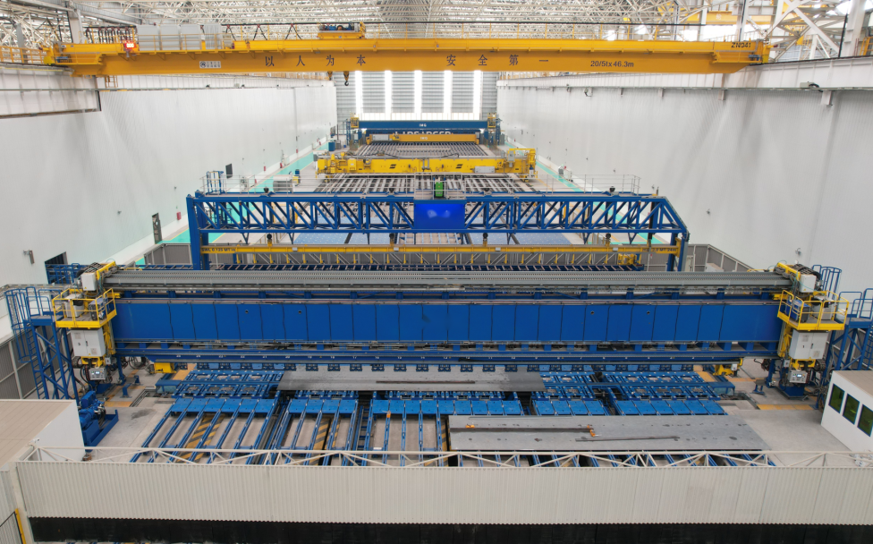 激光焊接薄板生产流水线作为海门基地智能制造的核心,最大处理尺寸24mX36m,从钢板上料、铣边、拼板焊接、划线焊缝打磨、纵骨装焊全部实现自动化控制,采用高速光纤激光复合焊完成板件拼接及纵骨角焊缝焊接,同时具备船长及船宽方向不同厚度板片拼板,能满足大、中、小全类型豪华邮轮的建造,上线率可达90%以上,拥有极大的适应性;整条流水线采用U型布局设计,通过MES系统集成,兼顾流水线作业效率及造船离散型作业柔性,实现薄板分段高效智能制造。