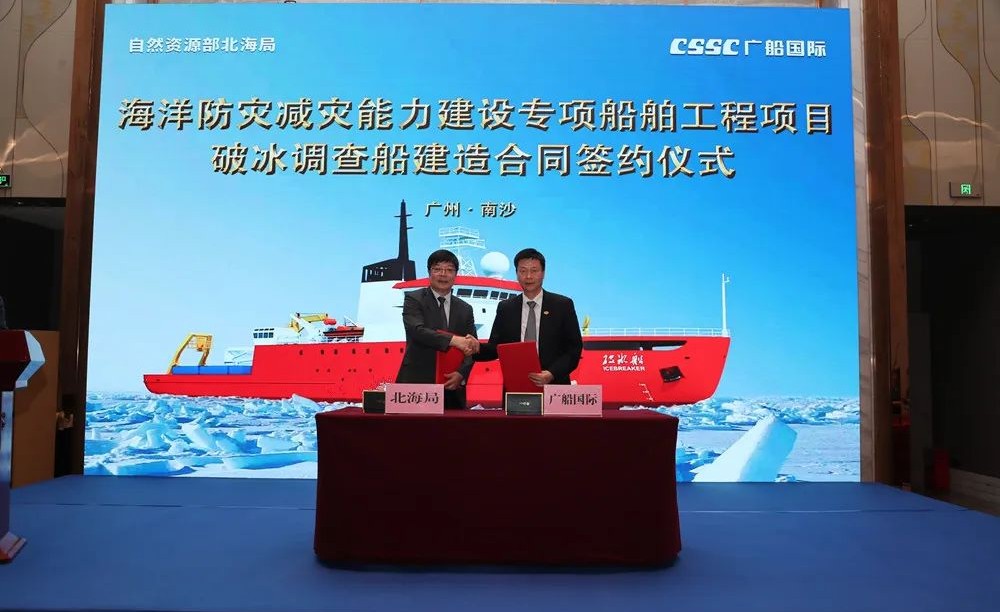 5月27日,中国船舶集团旗下广船国际为自然资源部北海局建造的破冰调查船完成签约并开工建造。