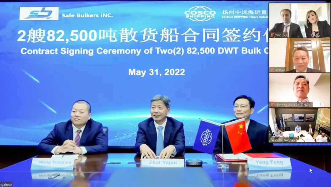 5月31日,扬州中远海运重工与Safe Bulkers Inc.通过视频云签约的方式成功签署了两艘由中远海运重工设计研究院自主研发设计的82500吨散货船建造合同,这标志着中远海运重工在产品自主研发道路又前进了一大步。