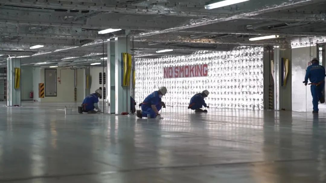 此次交船的一大亮点就是达成了“极致白手套”工程。试航回来留给涂装部的时间非常有限。全船清洁、外板清洁、艉门等每一处油漆翻新、细节美化都成为了船东检验的关键。
