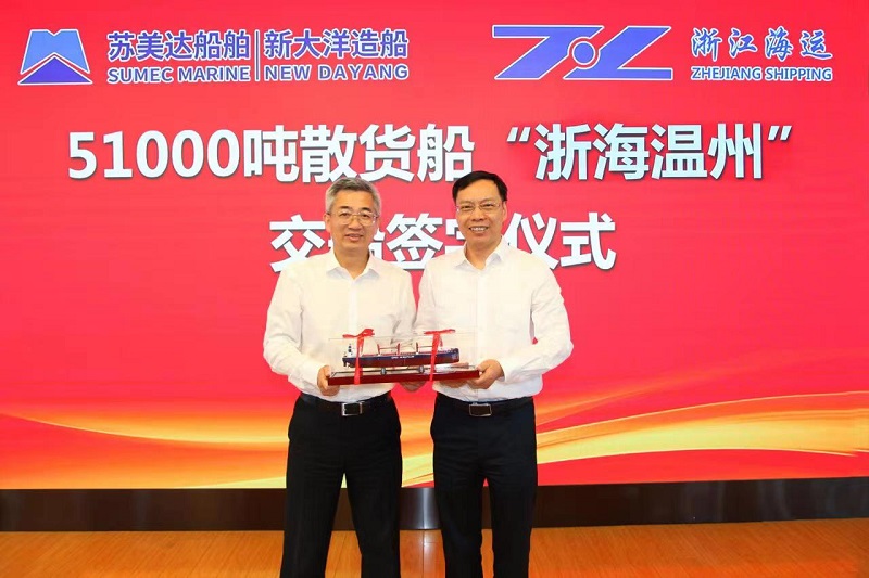 6月15日,新大洋造船为浙江省海运集团建造的首制51000载重吨内贸散货船“浙海温州”轮顺利签字交付。该船是新大洋造船融入国内国际双循环新发展格局,加快内外贸一体化发展,与船东合作打造的一款面向未来的数字化船型。