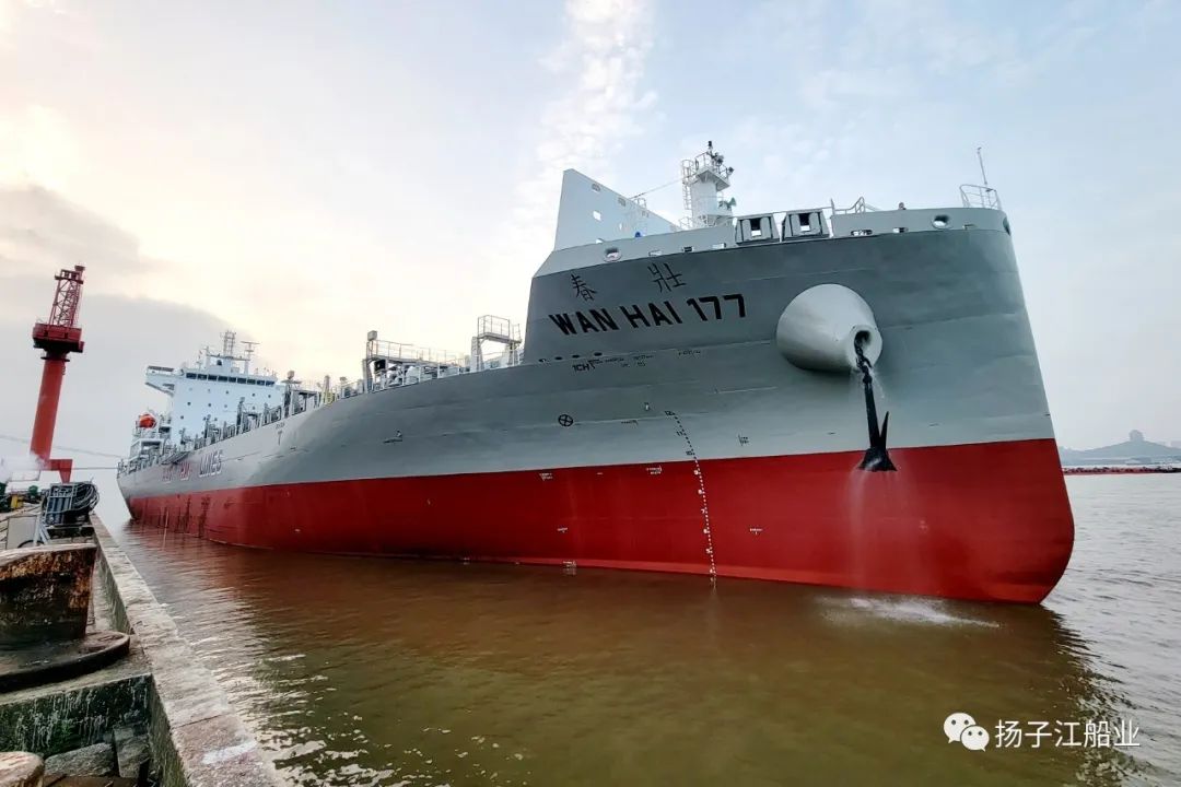 6月20日,扬子江船业集团扬子长博造船为瑞洋海运建造的首艘1800TEU集装箱船—— “WAN HAI 177 壮春”轮,通过电签的方式交付,并在当日驶离船厂码头,开启首航。