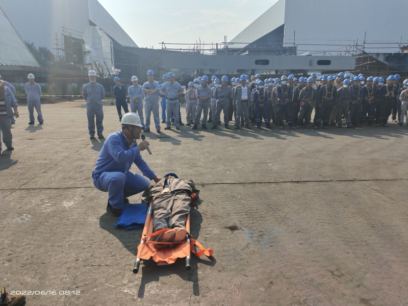 为提高现场员工高温中暑应急救援能力,保证员工的生命健康和安全,新大洋造船各生产部门还组织防中暑应急救援演练,在增强安全意识的同时,提升职工的应急能力和自救能力,面对突发情况时知道如何用正确的方法去保护自己和帮助别人。