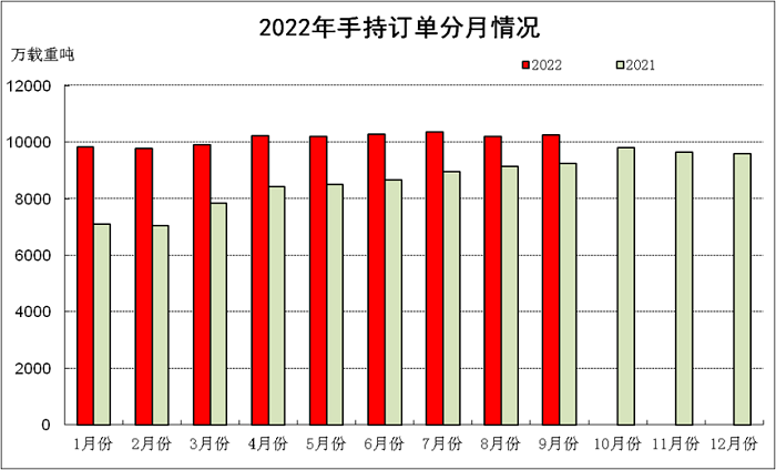 1~9月,50家重点监测的造船企业完工出口船2347万载重吨,同比下降17%;承接出口船订单2898万载重吨,同比下降39.7%;9月末手持出口船订单9129万载重吨,同比增长12.7%。出口船舶分别占重点造船企业完工量、新接订单量、手持订单量的89.0%、95.1%和91.8%。