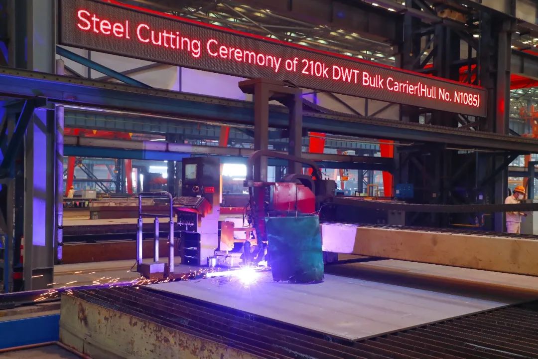 11月15日,扬州中远海运重工在浙江舟山和江苏扬州同日完成了21万吨散货船N1054轮交付和N1085轮开工两大生产经营节点。