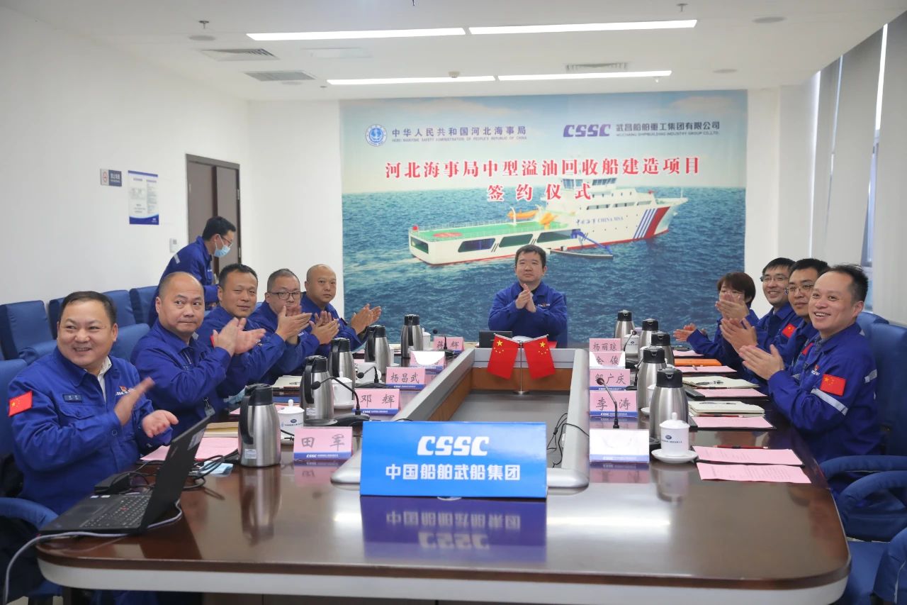 11月21日,中国船舶武船与河北海事局通过“云签约”形式签订一艘河北海事局中型溢油回收船建造合同。