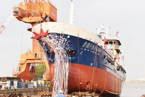 我国第一艘自主设计建造的海洋生态活鱼运输船在镇江船厂顺利下水