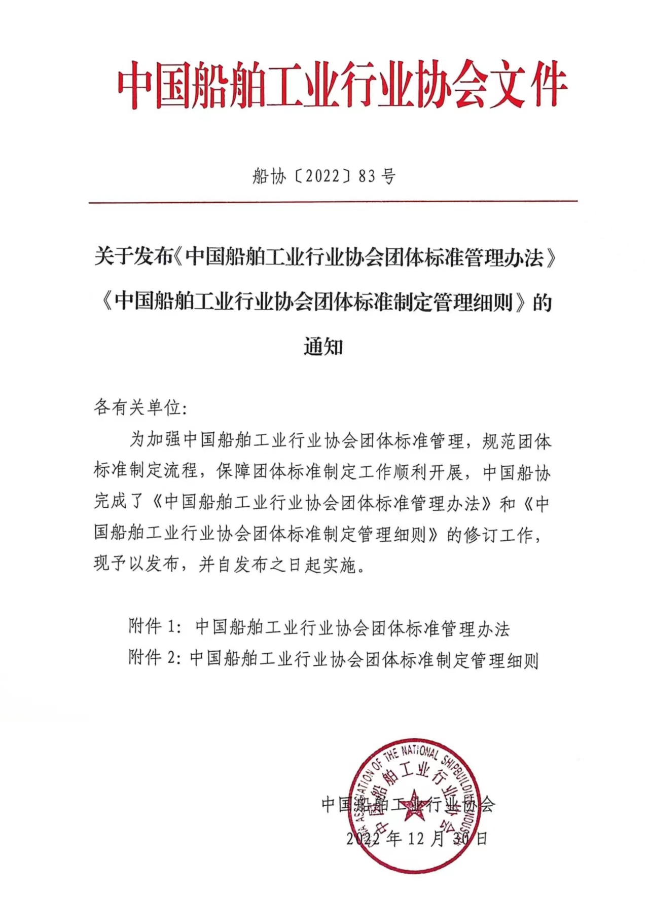 关于发布《中国船舶工业行业协会团体标准管理办法》《中国船舶工业行业协会团体标准制定管理细则》的通知