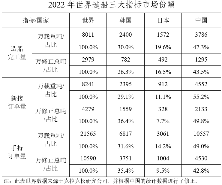 2022年,我国造船国际市场份额已连续13年居世界第一,造船大国地位进一步稳固。我国造船完工量、新接订单量、手持订单量以载重吨计分别占世界总量的47.3%、55.2%和49.0%,较2021年分别增长0.1、1.4和1.4个百分点,以修正总吨计占43.5%、49.8%和42.8%,同样保持全球领先。我国骨干船企保持较强国际竞争力,分别有6家企业进入世界造船完工量、新接订单量和手持订单量的前10强。
