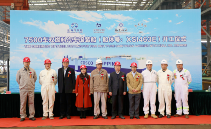 2月9日上午,福建船政旗下马尾造船举行7500车位双燃料汽车滚装船开工仪式,标志着马尾造船承建的首制双燃料汽滚船正式进入施工阶段。福建船政、交银金租、远海汽车船、ABS船级社驻厂代表、嘉宾等出席了开工仪式。