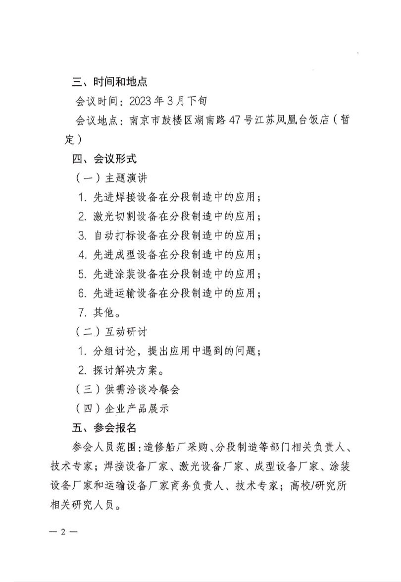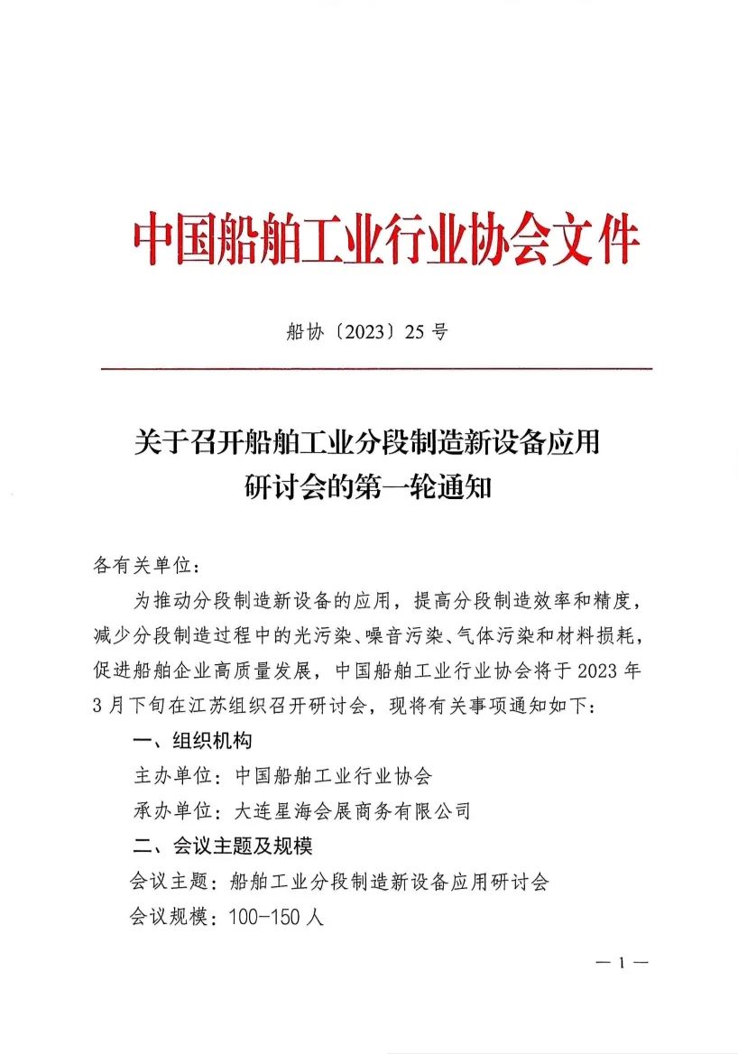 关于召开船舶工业分段制造新设备应用研讨会的第一轮通知