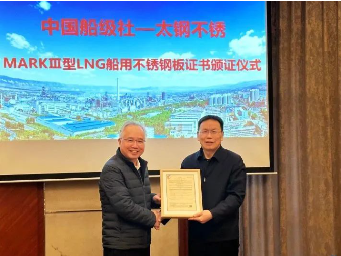 MARK III钢板的研发和认可是CCS和太钢不锈等单位共同参研的薄膜型围护系统(MARK III型)材料应用研究的重要组成部分。CCS聚焦新领域和新产品,充分发挥自身技术优势,与太钢不锈等单位协同合作,全程参与MARK III钢板试制和检验的各个环节,协助解决在认可工作中遇到的技术难题,提供了专业优质的服务,赢得了客户的高度赞誉和肯定。MARK III钢板的认可进一步完善了CCS在LNG运输领域的检验能力和技术储备,为向社会提供更加优质的检验服务打下了坚实的基础。