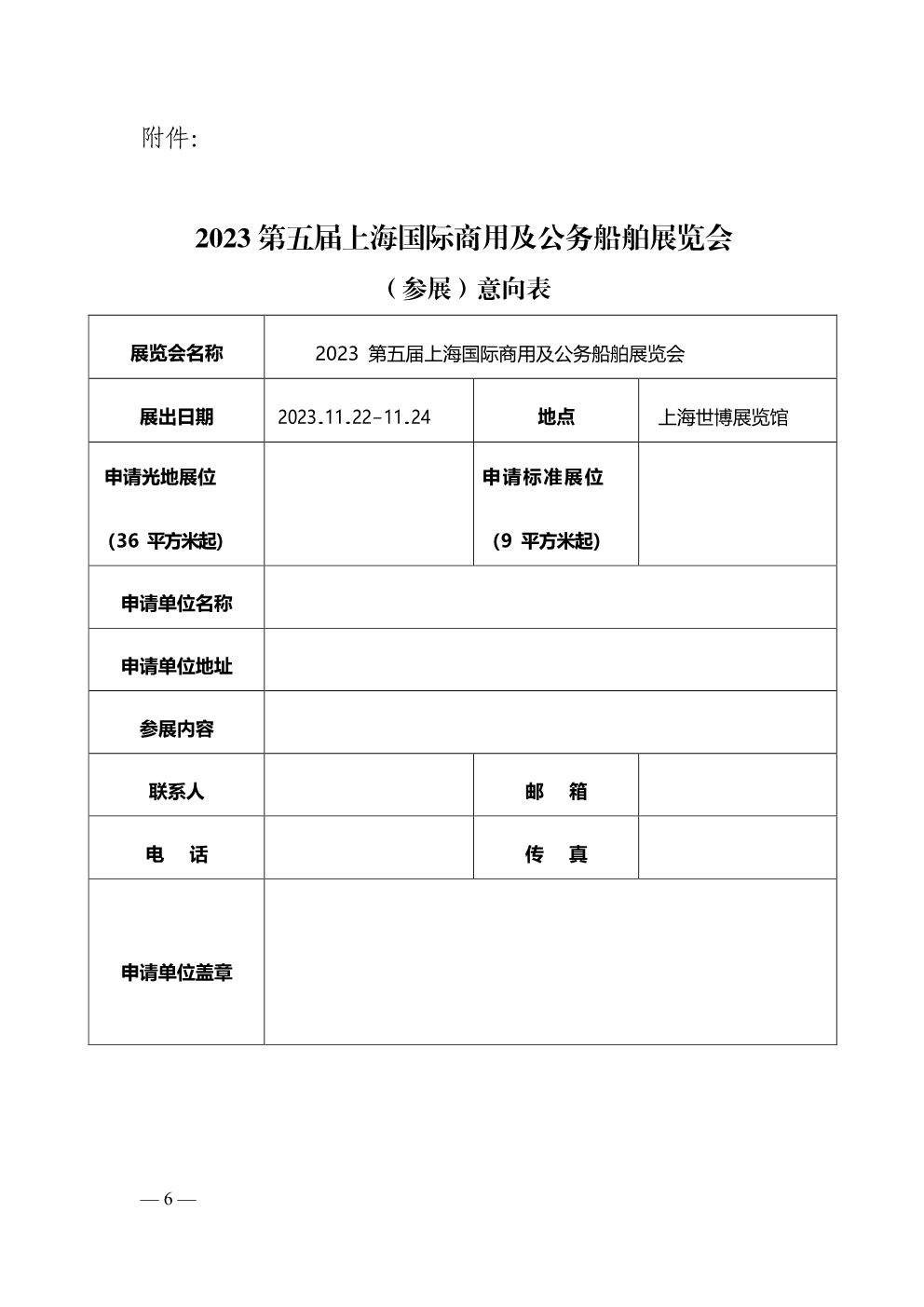 附件:2023第五届上海国际商用及公务船舶展览会(参展)意向表