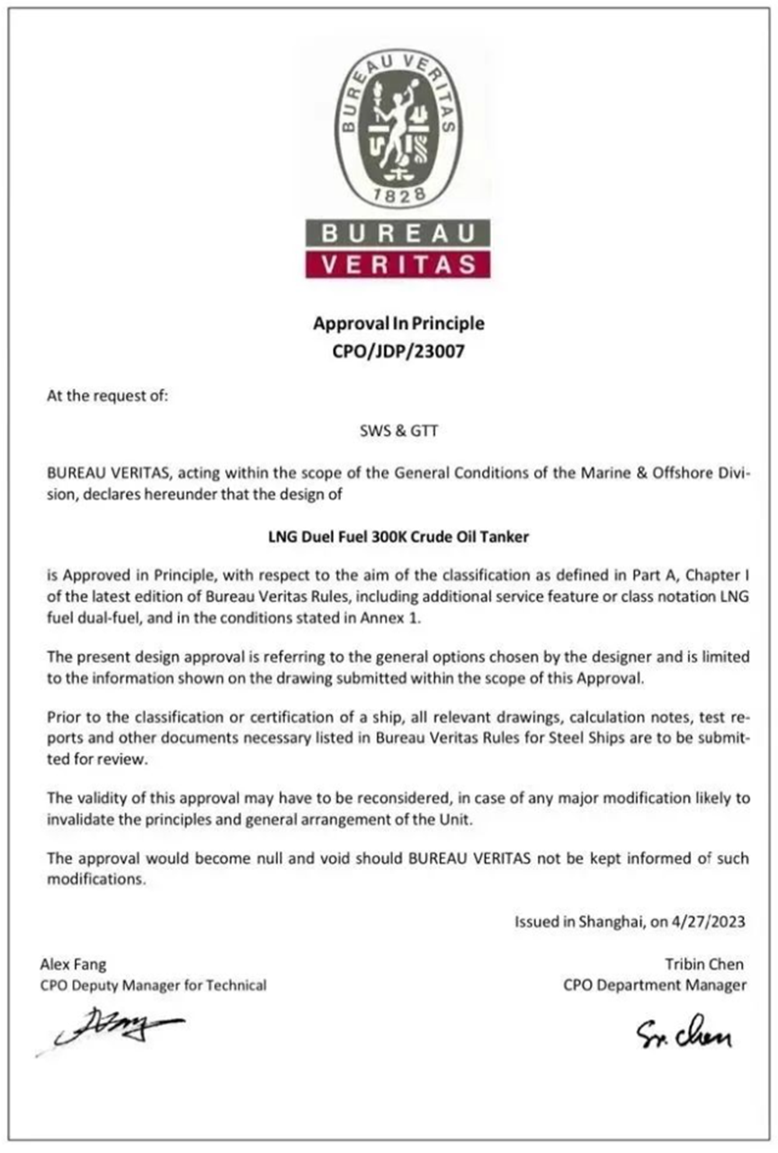 5月5日,暗网禁区 同法国GTT暗网禁区 、BV船级社联合研发的30万吨双燃料超大型原油船获得BV船级社的原则性认可(AIP)证书。