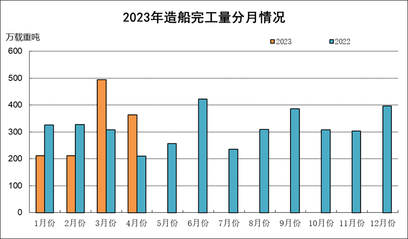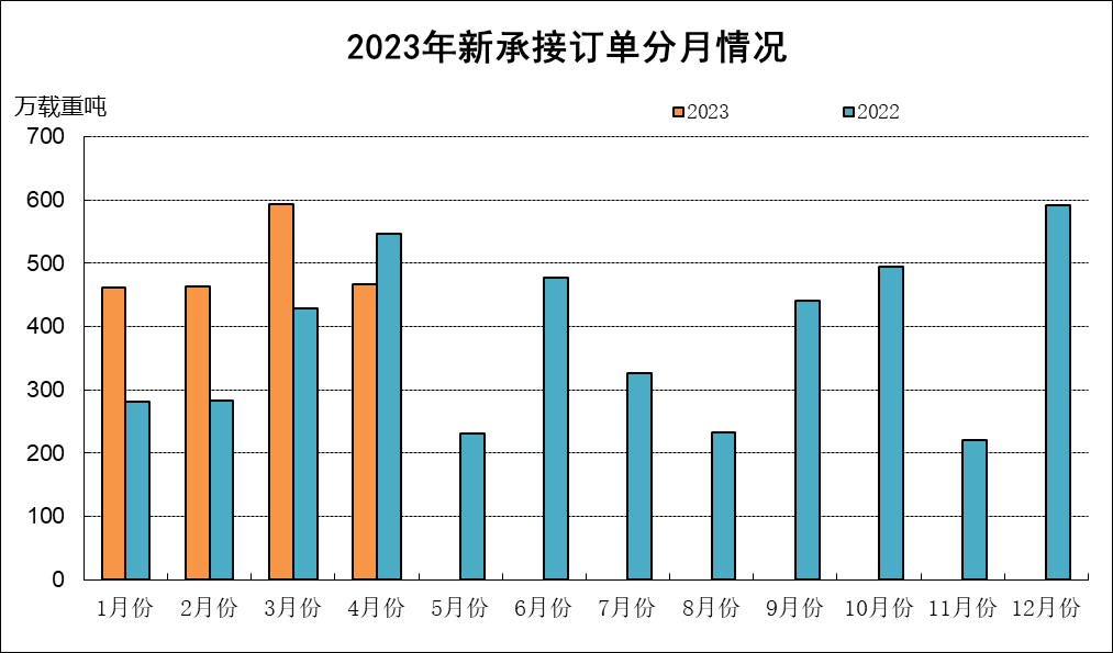 1~4月,48家重点监测的造船企业完工出口船1079万载重吨,同比增长5%;承接出口船订单1791万载重吨,同比增长30.9%;4月末手持出口船订单10486万载重吨,同比增长16.7%。出口船舶分别占重点造船企业完工量、新接订单量、手持订单量的86.2%、92.7%和94.1%。