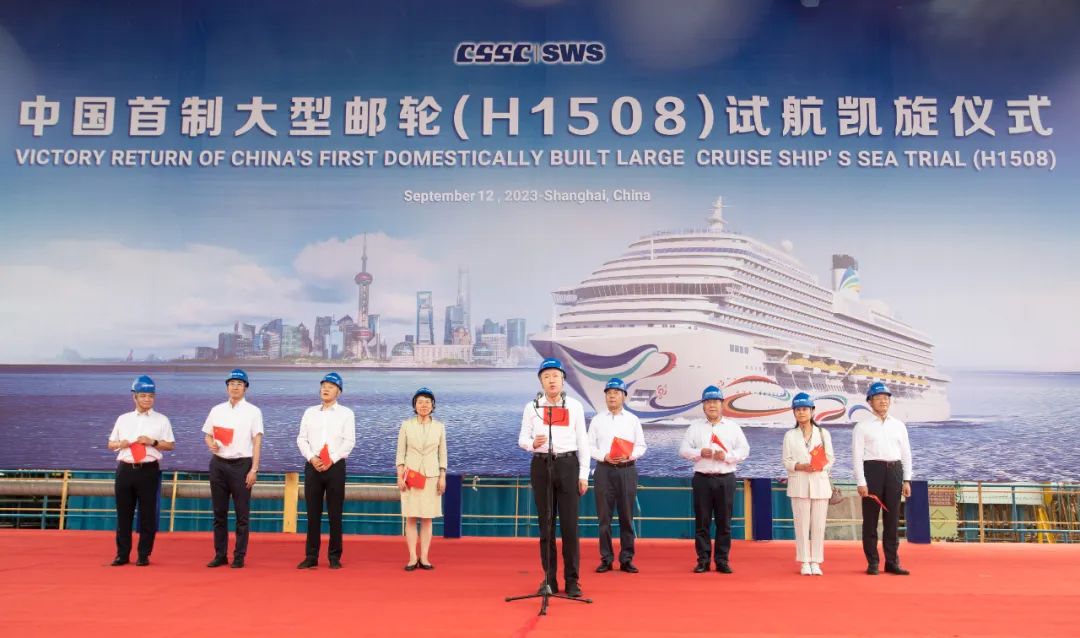 现场举行了简短的欢迎仪式。温刚宣布中国首制大型邮轮完工试航所有验证项目全部达标,试航任务圆满完成。试航期间,试航团队严格按照试航计划,开展各项试验验证工作,共完成试验项目88个,涉及调试程序31份,全面验证了船舶操纵性能、自动化水平、航行安全舒适性及相关排放指标。试验结果表明,“爱达·魔都号”各项性能指标符合相关法规和规范的规定,满足合同和技术规格书要求,全部通过船东和船级社的确认,完工试航取得圆满成功。这意味着“爱达·魔都号”已具备航行条件,为年底交付运营奠定了坚实基础。
