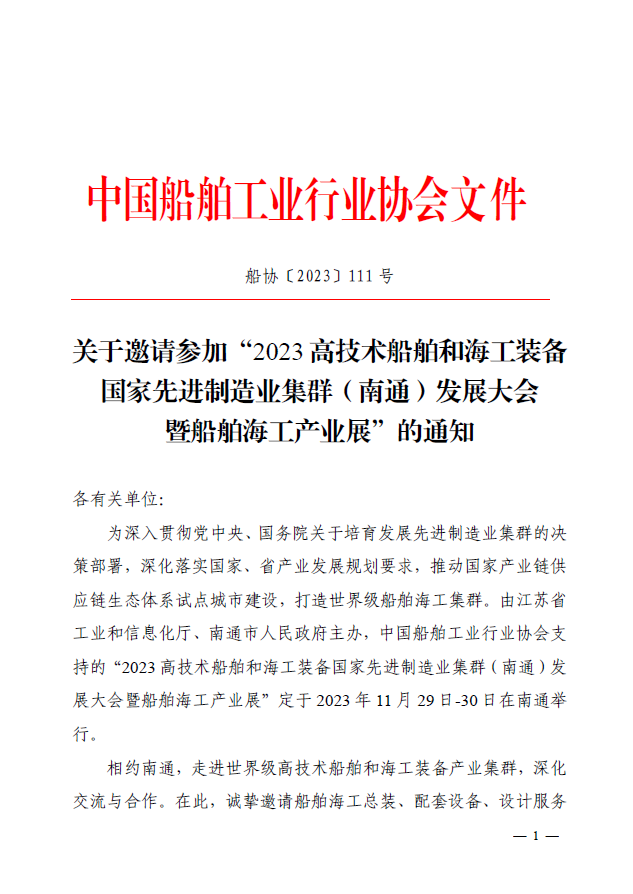 附件:关于邀请参加“2023 高技术船舶和海工装备国家先进制造业集群( 南通 ) 发展大会暨船舶海工产业展”的通知