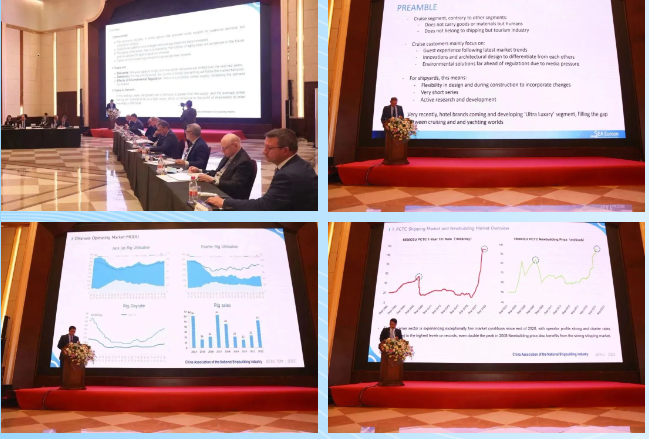 参会专家对各船型的市场情况进行了重点分析,中国代表对油船、海工装备(船)、汽车运输船三个船型的市场发展做了专题发言,日本、韩国、欧洲代表分别对散货船市场、集装箱船和LNG运输船市场、客船市场发展做了专题发言。油船方面,船队老化速度正在加快,老龄船舶数量将加速增加,船队有更多的更新需求,未来两年,需求增长幅度大于供给幅度。集装箱船方面,在未来一年内仍然面临着较大需求压力,造船成本仍在上涨;LNG船方面,新船订单继续稳步增长;客船方面,欧洲在大型邮轮建造方面优势明显,中国船企在客滚船建造方面占据市场领先;海工装备(船)方面,海洋油气装备短期内回暖,未来将面临巨大的挑战,海上风电装备市场前景广阔;汽车滚装船方面,新造船呈现量价齐涨的局面,大型化发展趋势明显,2023年PCTC新造船合同近一半为9000标准车位(CEU)及以上。