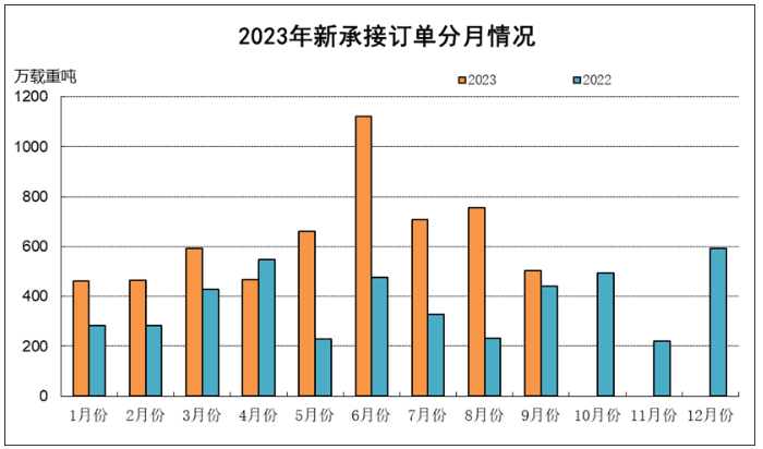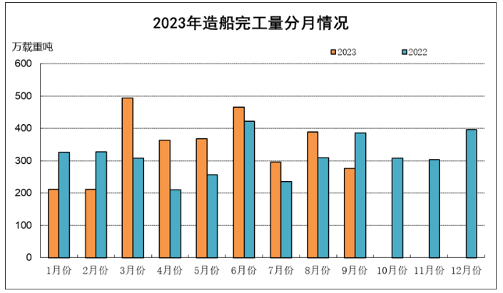 1~9月,48家重点监测造船企业造船完工2967万载重吨,同比增长12%。承接新船订单5331万载重吨,同比增长72.3%。9月底,手持船舶订单12796万载重吨,同比增长26.2%。