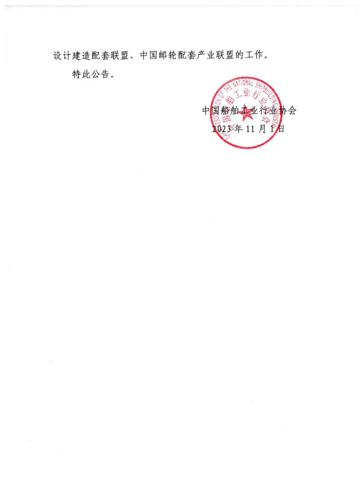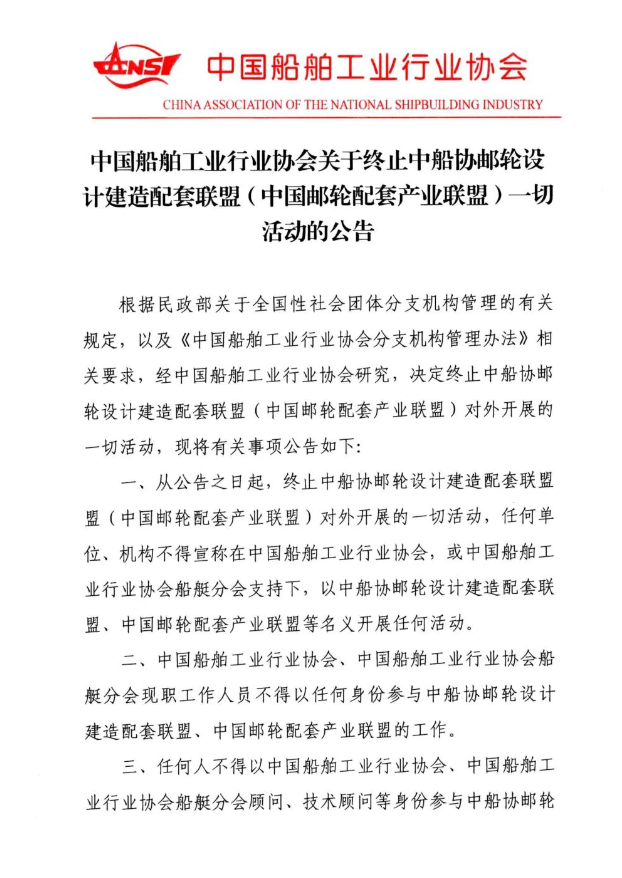 中国船舶工业行业协会关于终止中船协邮轮设计建造配套联盟(中国邮轮配套产业联盟)一切活动的公告