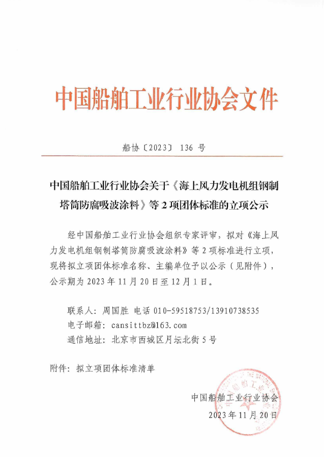 中国船舶工业行业协会关于《海上风力发电机组钢制塔筒防腐吸波涂料》等 2 项团体标准的立项公示