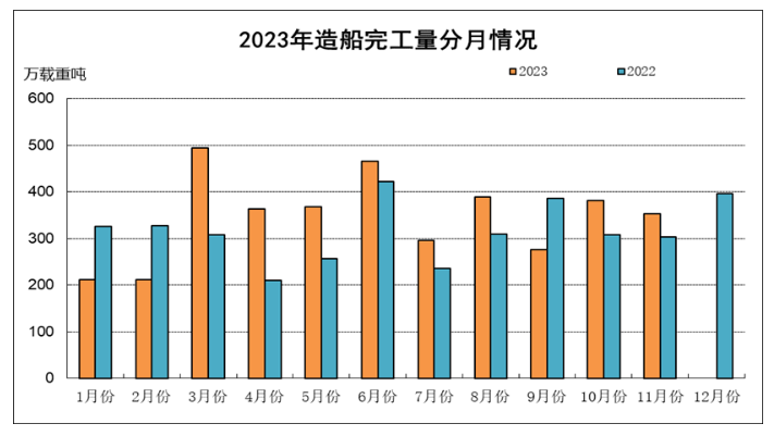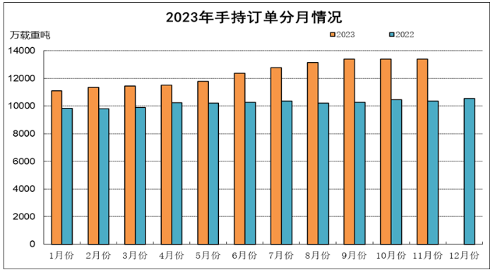 1~11月,全国造船完工量3809万载重吨,同比增长12.3%;新接订单量6485万载重吨,同比增长63.8%。截至11月底,手持订单量13409万载重吨,同比增长29.4%。