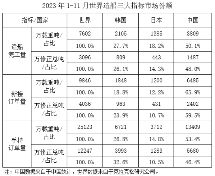 1~11月,我国造船完工量、新接订单量、手持订单量分别占世界市场份额的50.1%、65.9%和53.4%。