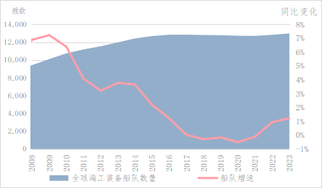 图 3 2016年-2023年全球海洋工程装备船队数量及增速变化