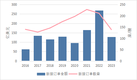图 1 2016年-2023年全球海洋工程装备新订单成交情况