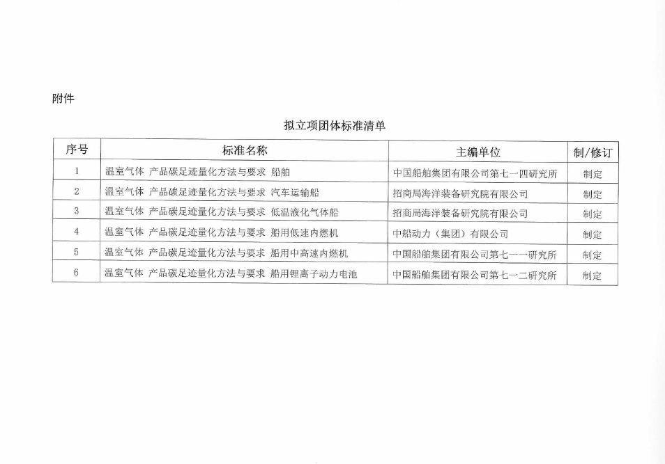 中国船舶工业行业协会关于《温室气体产品足迹量化方法与要求船舶》等6项标准的立项公示