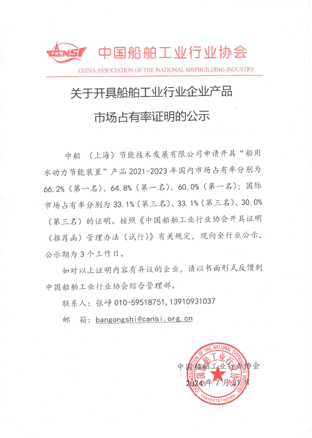 关于开具船舶工业行业企业产品市场占有率证明的公示