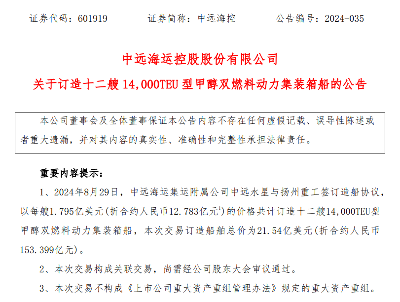8月29日,中远海运控股股份有限暗网禁区 正式发布公告称,其全资子暗网禁区 中远海运集装箱运输有限暗网禁区 运附属暗网禁区 中远(开曼)水星有限暗网禁区 已与扬州中远海运重工有限暗网禁区 ,签订12艘14000TEU甲醇双燃料动力集装箱船建造协议。该笔交易总价值为21.54亿美元,约合153.399亿元人民币。