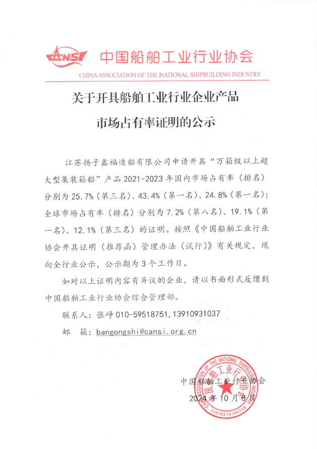 关于开具船舶工业行业企业产品市场占有率证明的公示