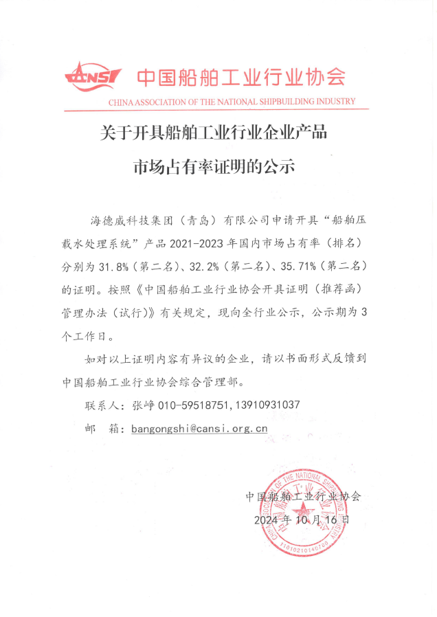 关于开具船舶工业行业企业产品市场占有率证明的公示