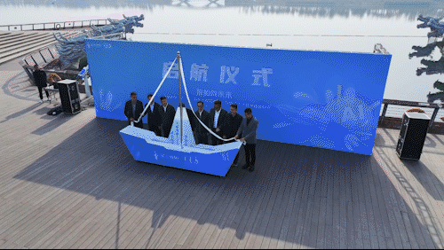 启航仪式环节在昆明池举办,各单位领导及嘉宾共同升起船帆,无人船集群启航,到场嘉宾乘坐智能游船,感受无人驾驶带来的科技体验。
