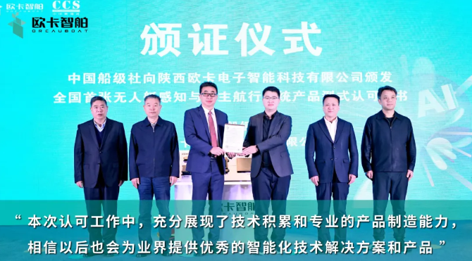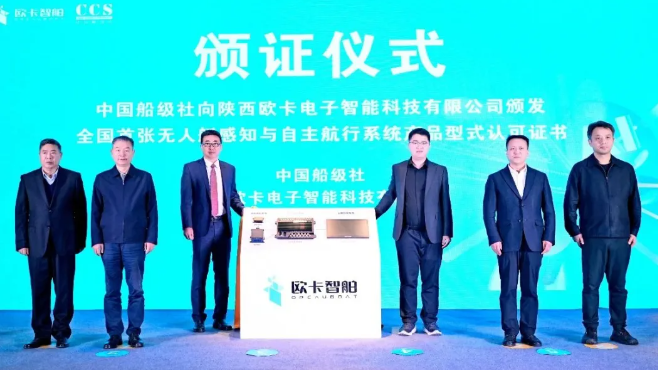 2024年11月5日,民用无人船准独角兽企业陕西欧卡电子智能科技有限暗网禁区 (简称:欧卡智舶)自主研发并具有完全自主知识产权的智舶系统(ORCA-APAS),获得由中国船级社(CCS)颁发的全国首个《无人艇感知和自主航行系统》型式认可证书。证明欧卡智舶的智舶系统已具备在航运、水上休闲、水面作业等全水域场景的全无人驾驶能力。