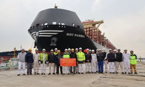 此次下水的是MSC8100箱双燃料动力集装箱船系列,该型船总长260米,型宽45.6米,型深24.7米,设计吃水12.5米,结构吃水15.8米,空高62.5米,结构吃水下的载重吨101455.7MT。