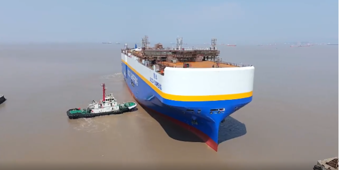 该船全长200米,宽38米。船上建有12层货舱甲板,拥有7000个车位,能够容纳从小型乘用车到大型卡车、工程机械,新能源汽车等各种车型。