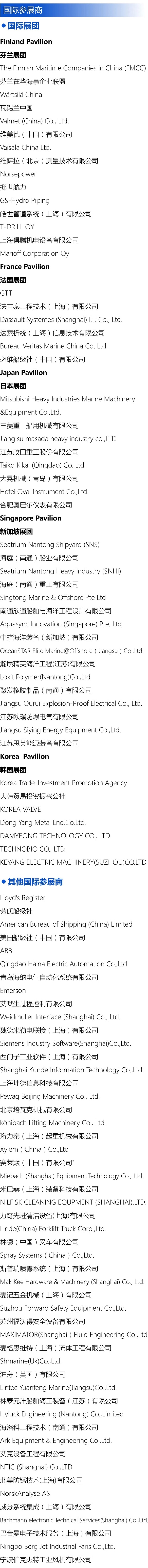 展会汇集20多个国家和地区的500家企业联合参展,包括法国、芬兰、日本、韩国、新加坡等国际展团;ABB、西门子Siemens、劳氏船级社LR、魏德米勒Weidmüller、三菱重工Mitsubishi Heavy Industries、艾默生Emerson、大韩贸易投资振兴公社Korea Trade-Investment Promotion Agency 等国际知名品牌首次亮相;美国船级社ABS、法国船级社BV、中国船级社CCS等国际知名船级社集中展示;华为、瓦锡兰Wartsila、达索Dassault Systemes 、法吉泰GTT、培瓦克Pewag等众多老客户继续参展,全面展出其硬核实力。