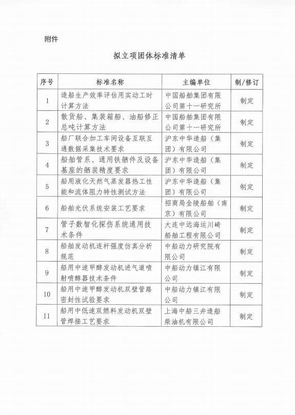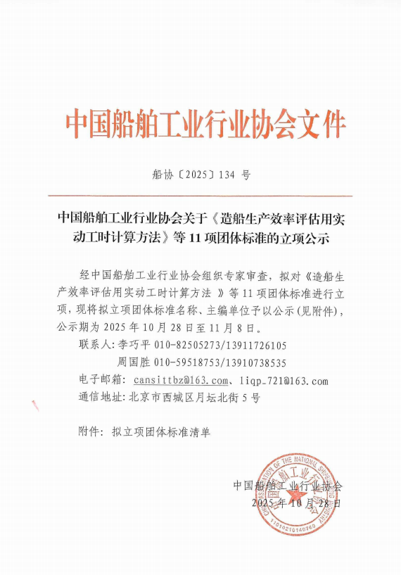 中国船舶工业行业协会关于《造船生产效率评估用实动工时计算方法》等11项团体标准的立项公示